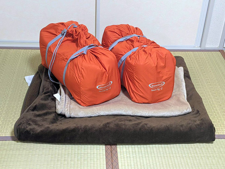 後半戦の出発時には電気毛布、冬用寝袋、夏用の寝具を積みました。