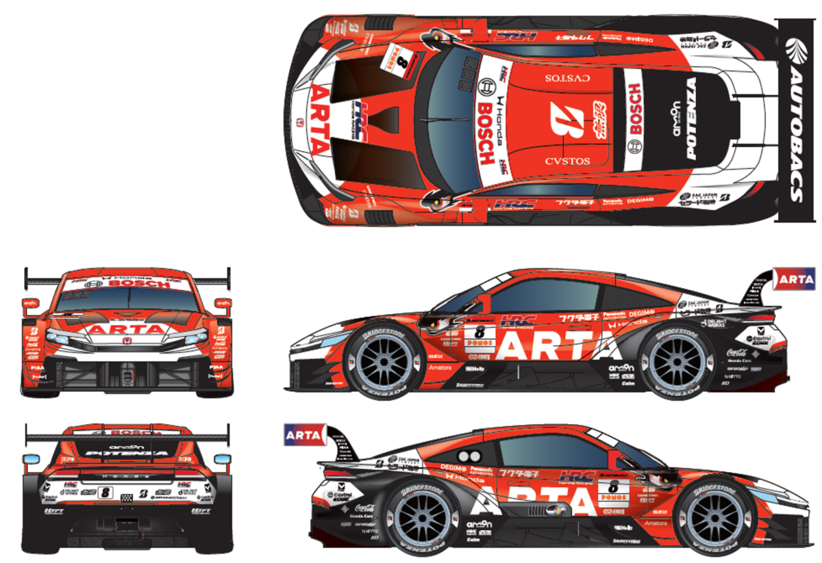 ARTAの象徴であるARTAオレンジを基調に、HRCのレーシングスピリットを重ねたカラーリングを採用。円弧モチーフや横断的に走るオレンジのストロークが、サーキットでひと目でARTAと分かる強い存在感を放ちます。