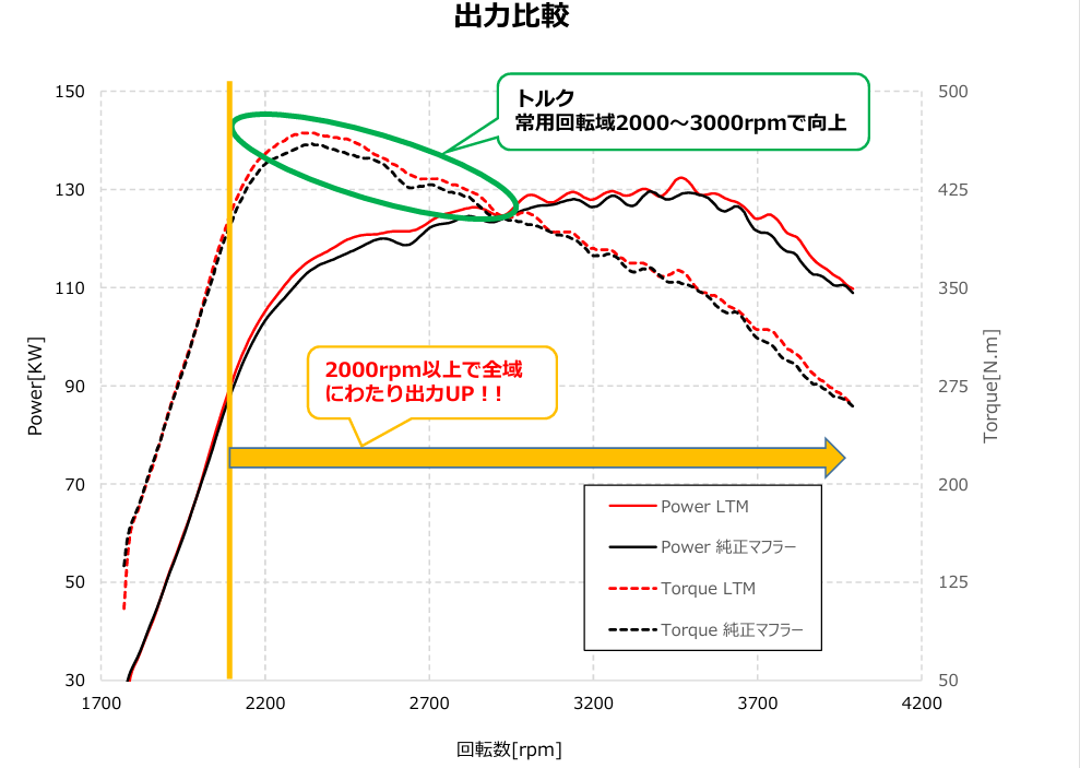 - 特に常用回転域である2000~3000rpmでトルクが向上しているため、日常運転での扱いやすさが向上します。発進や追い越し加速時に効果を発揮します。