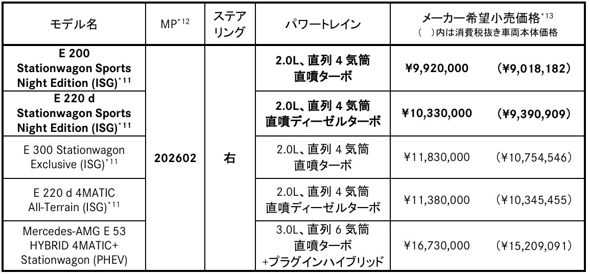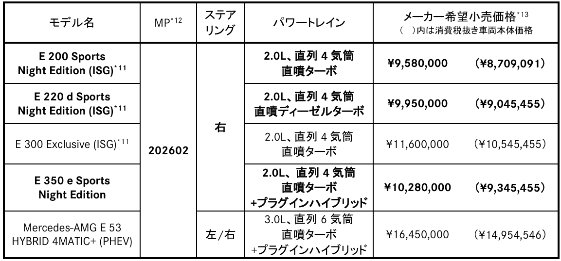 メルセデス・ベンツ日本合同会社(社長 兼 CEO: ゲルティンガー 剛、本社: 千葉県千葉市)は、メルセデス・ベンツの中核モデルである E クラスセダン/ステーションワゴンに「E 200 Sports Night Edition (ISG)3 」、「E 200 Stationwagon Sports Night Edition (ISG)3 」(以下、E 200)、「E 220 d Sports Night Edition (ISG)3 」、「E 220 d Stationwagon Sports Night Edition (ISG)3 」(以下、E 220 d)、「E 350 e Sports Night Edition」(以下、E 350 e)を追加し、全国のメルセデス・ベンツ正規販売店ネットワークを通じて本日より発売します。