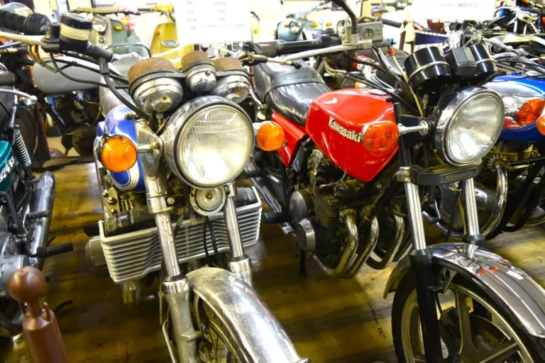 館内に足を踏み入れる瞬間は、まるで宝箱のフタを開けるよう。かつての名車たち、日本のバイク黎明期に生まれた重厚な鉄の塊たちが、およそ100台、整然と並んで迎えてくれます。